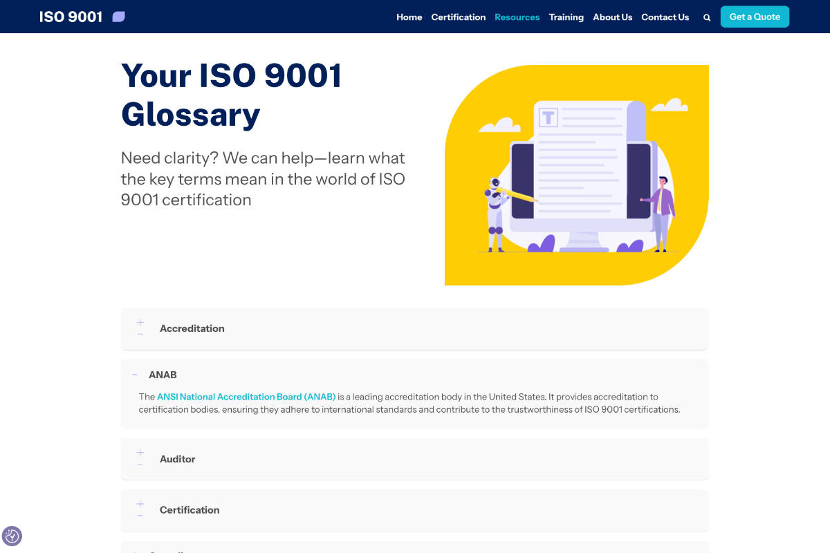 As we were targeting an audience without extensive knowledge of the ISO 9001 standard, we needed to create new content about a complicated subject matter accessible and easy to understand.