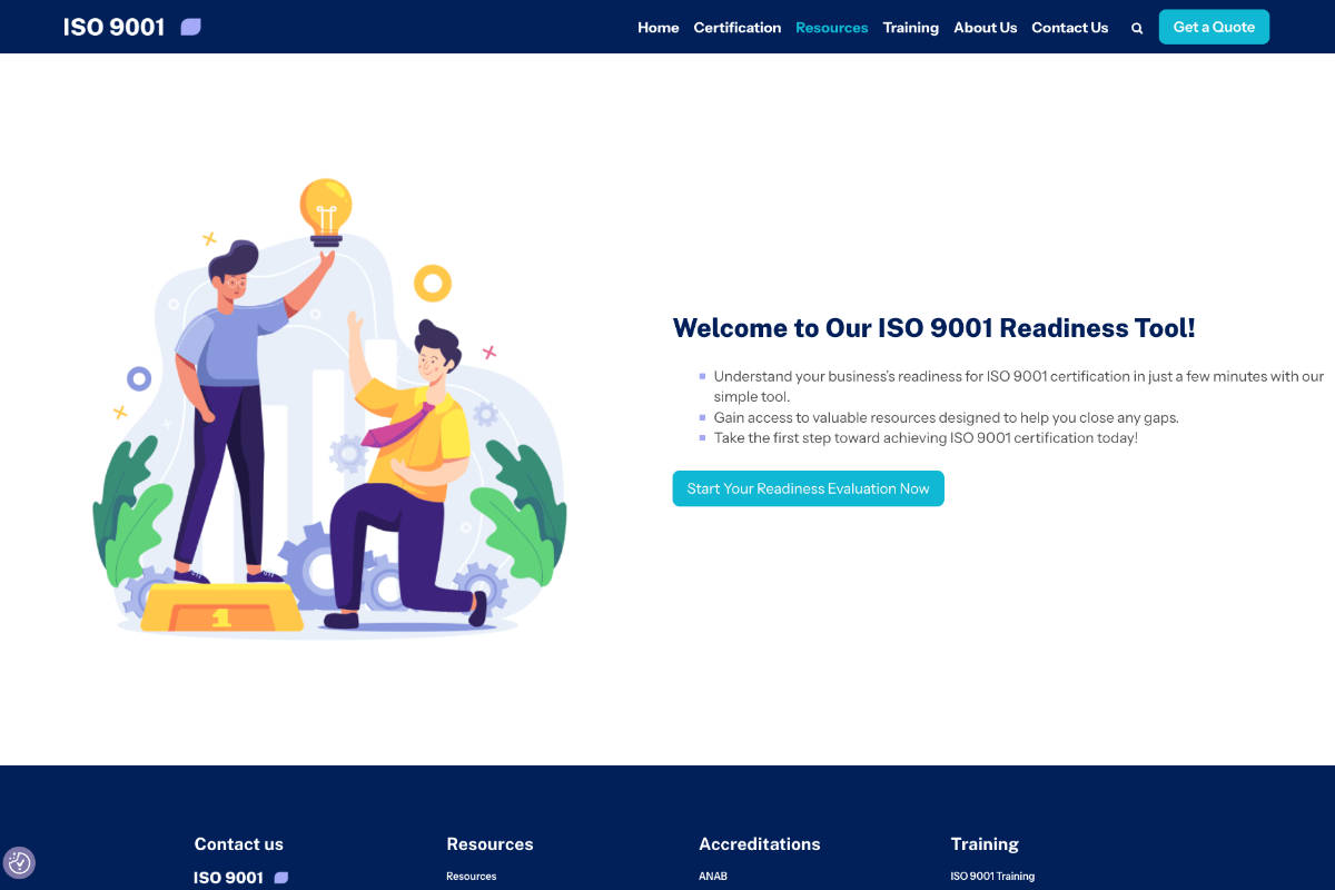 Additionally, Submerge developed an ISO Readiness Tool, which was added to the site. This is a free online resource businesses can use to find out how prepared they are for the ISO 9001 certification process.
